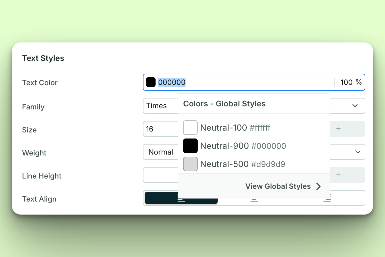 Manually setting font sizes, colors, and margins for each individual email is tedious and prone to errors. Global Styles let you work smarter by applying universal settings to components, freeing you up to focus on the content that truly matters.