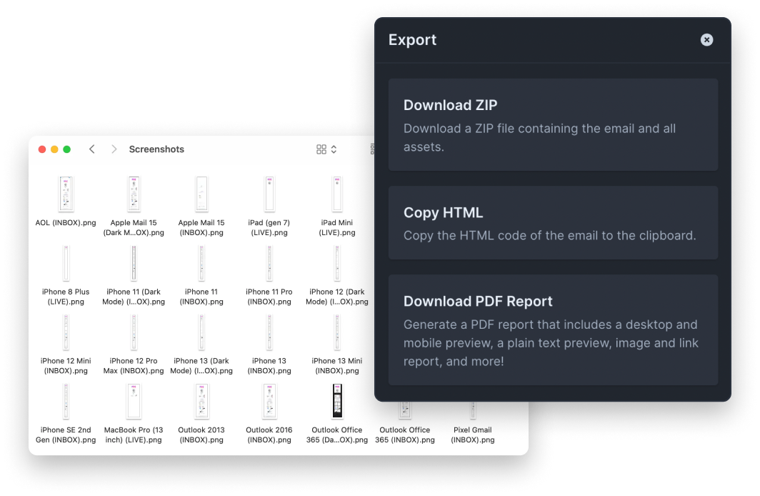 [Business Only] for easy stakeholder sharing in Slack or Teams, Download a PDF that is inclusive of both desktop and mobile previews, and all sending information related to your email.