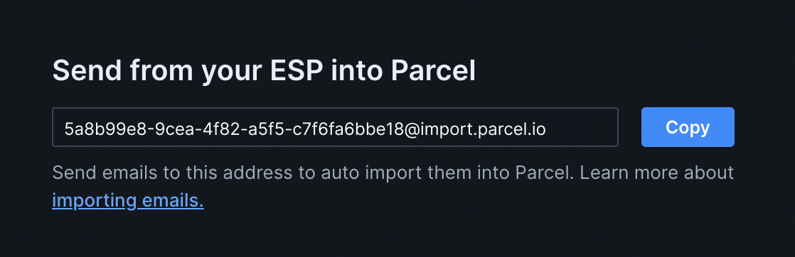 Grab your unique workspace email address from your Workspace Settings. If you have more than one workspace, you can navigate to https://parcel.io/settings/general, and then select the workspace you’d like to import your email into